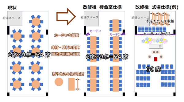 内容はこれからですが、お通夜を行わない30名程度の式場として利用と、出棺後の待合室としての利用が可能になります。